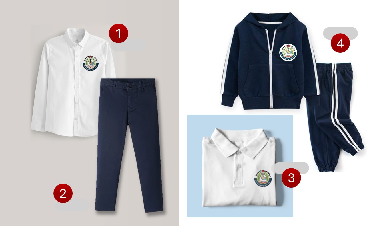 بدلة رياضية: تتكون من جاكت وبنطلون قطني مريح باللون الحكلي ، مع شعار المدرسة. وتيشرت رياضة قطني خفيف بأكمام قصيرة، مناسب لأنشطة الحركة واللعب.